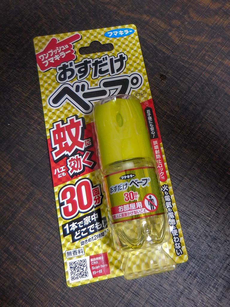 初見が お た す け に見えてしまうのですが、まさにこれテントにはお助けアイテムというべきで、テントの頂上吊って形ができたくらいに1プッシュ、落ち着いて中に入るよーという時に1プッシュ、朝方起きて1プッシュしとくと寄ってきかたが全然違います(テント内の通気具合で回数はだいぶ変わると思いますが)