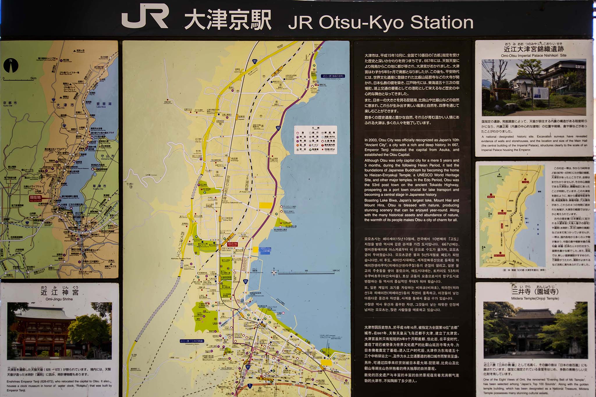 駅前の観光案内板。今日まわるところがだいたいカバーされていて、直前の確認にとても役立ちました。当然のことながら近江神宮も紹介されてますね。